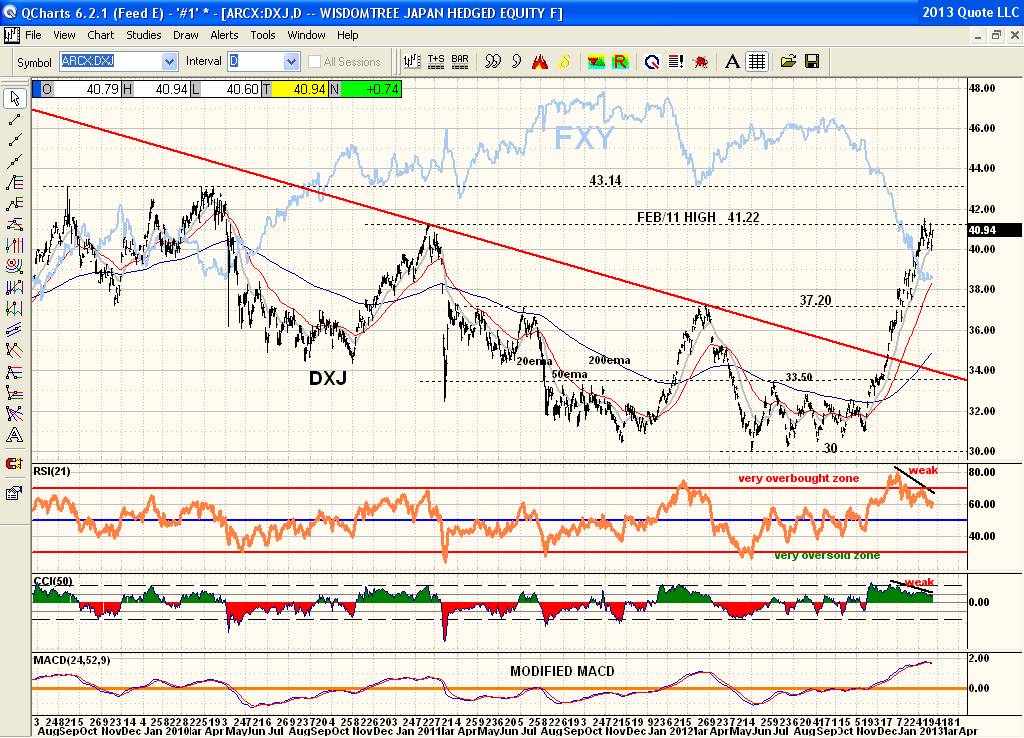 I agree. That is the most likely scenario as it does look like a major reversal. I expect DX to blow through 82 as well but could take some time to do it. I've been watching the Yen and see it is at long term support at 105 on the Yen ETF:FXY. The currency adjusted Japanese stock market ETF:DXJ trades inverse to the Yen. See it spinning its wheels at this two year double top at $41.22. Note the weak lower technicals with this double top especially the RSI 21. Technically the Yen ETF could bounce back to 111 and this DXJ could pullback to the 37.22 breakout point. Only a breakout over resistance would suggest a further rally in DXJ and further selloff in the Yen. A pullback in both these is more likely. But "IF" this Yen change is a major reversal in policy like it appears to be we could see a repeat of the Japanese stock market soaring like in the late 80's. But regardless it does look like Japan has just changed the rules of the game with the currencies and the XXXX should hit the fan all over the place......................... I think the big winner will be DX with the currency wars likely right in front of us.