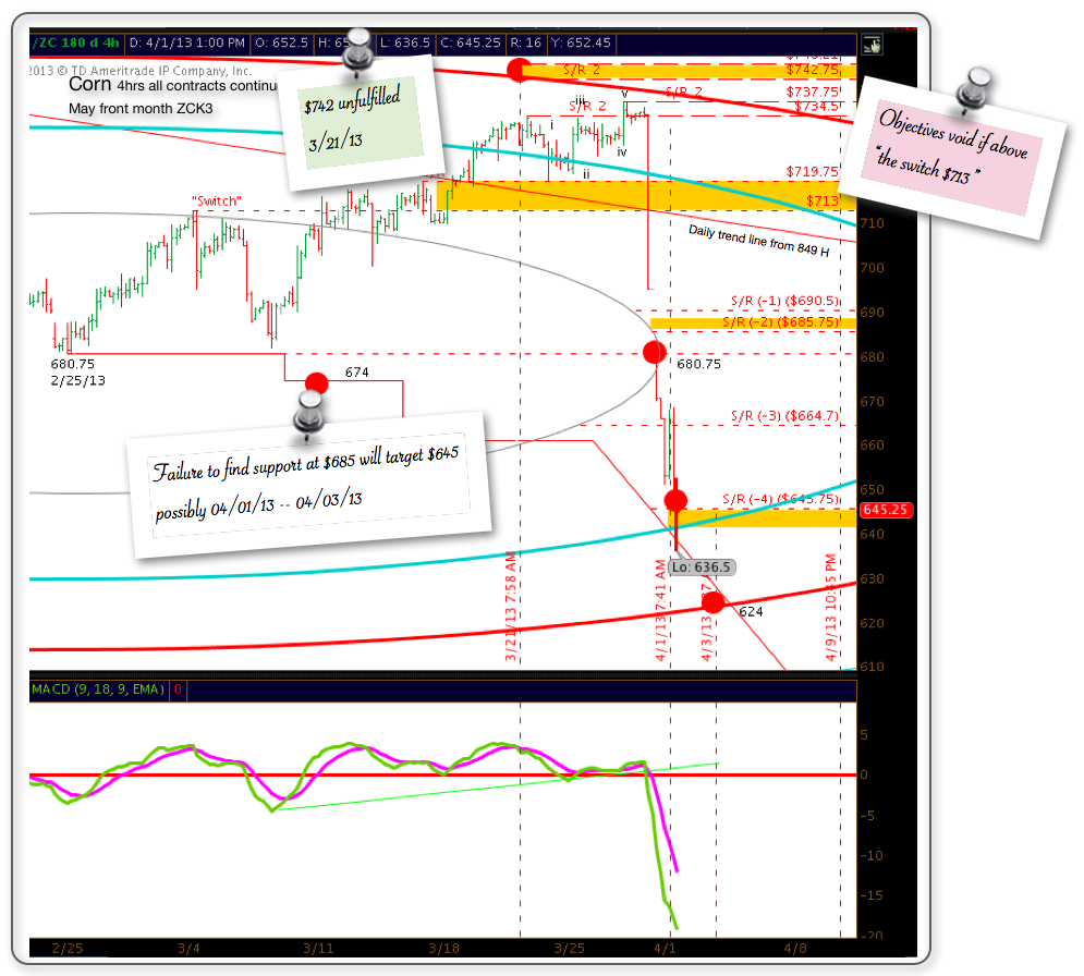 You never know what's gonna happen, but you can study the possible outcomes, formulate a plan, and give it your best shot. Below is the final May Corn 4 hrs chart. Basically May Corn hit the $645 objective today, April 1st. (time and price) What's amazing is that the targets where posted some time back and I didn't know how it was going to unfold, or even if those targets will ever be hit, Not so much horizontally (price) but vertically (time).