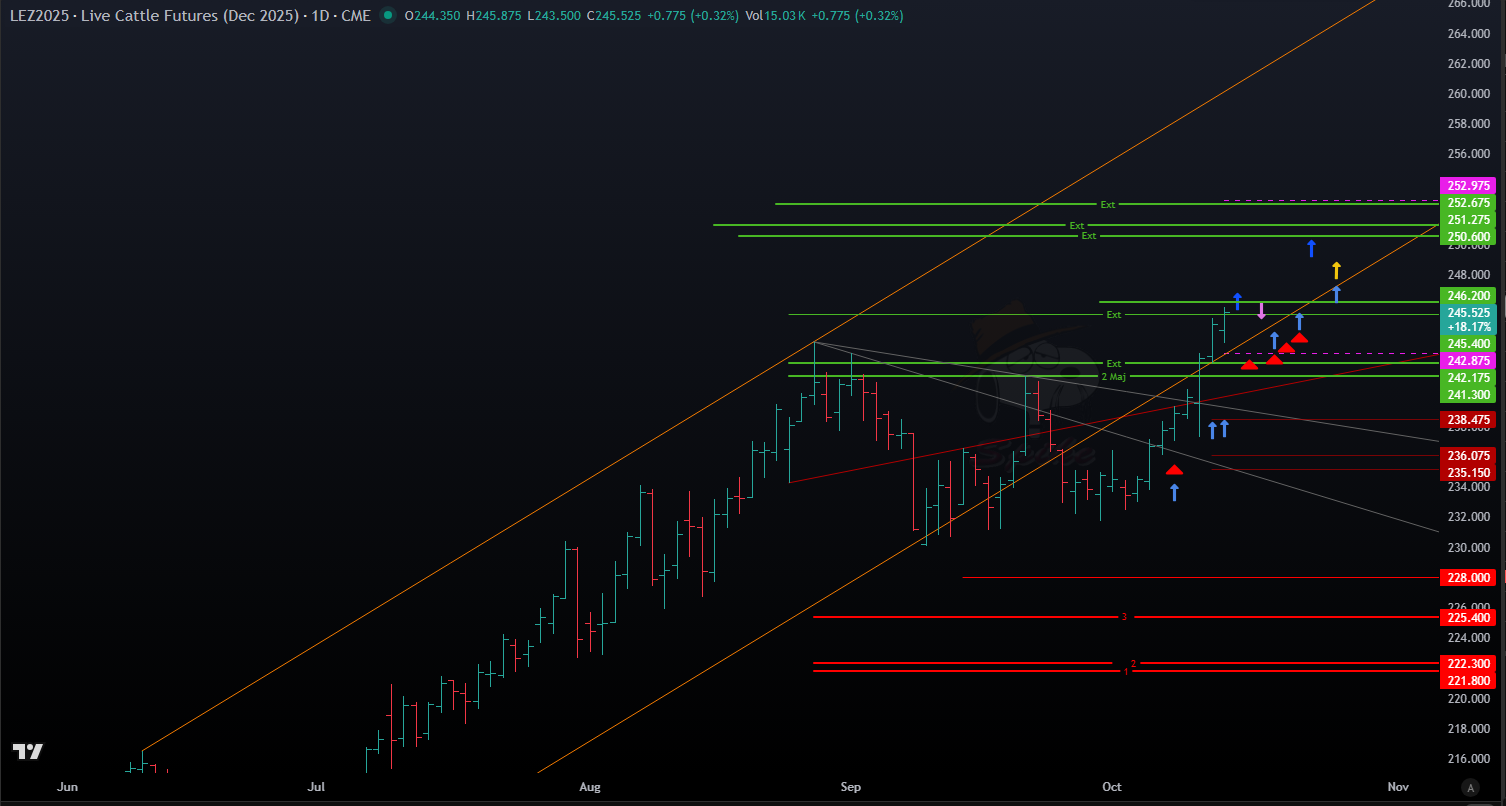 You have a daily cattle turn date on Wednesday... It's not a strong one. You may see a two day correction here to test support at 240... If this high today holds tomorrow you may see a run to test a tentative reversal at 238.47... worse case you would see the 3rd tentative be hit at 235.15. The next turn on the daily will be a low aggregate on Friday...